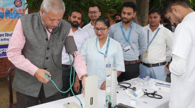 – मंगलायतन विश्वविद्यालय के निःशुल्क स्वास्थ्य शिविर का ग्रामीणों ने उठाया लाभ मंगलायतन विश्वविद्यालय के पत्रकारिता एवं जनसंचार विभाग द्वारा संचालित रेडियो नारद व स्मार्ट एनजीओ और राष्ट्रीय सेवा योजना (एनएसएस) इकाई-2 के संयुक्त तत्वावधान में विश्वविद्यालय परिसर के मुख्य द्वार पर निःशुल्क स्वास्थ्य शिविर का आयोजन किया। कार्यक्रम का शुभारंभ कुलपति प्रो. पीके दशोरा, संयुक्त कुलसचिव प्रो. दिनेश शर्मा और डीन एकेडमिक प्रो. राजीव शर्मा ने संयुक्त रूप से फीता काटकर किया। शुभारंभ के पश्चात कुलपति प्रो. दशोरा ने कहा कि स्वास्थ्य सबसे बड़ी पूंजी है, और स्वास्थ्य शिविर…