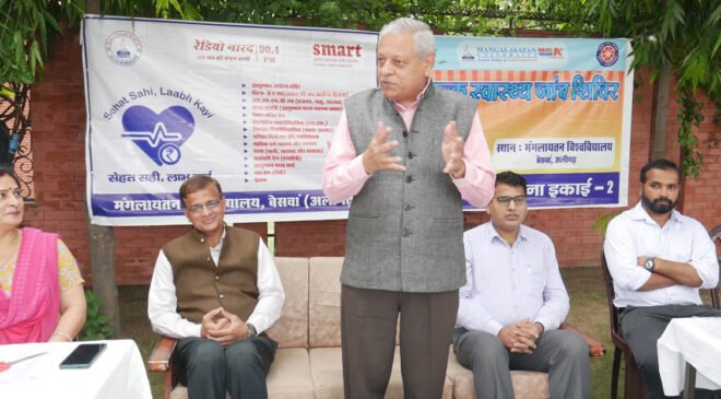 शुभारंभ के पश्चात कुलपति प्रो. दशोरा ने कहा कि स्वास्थ्य सबसे बड़ी पूंजी है, और स्वास्थ्य शिविर समाज के अंतिम व्यक्ति तक सेवा पहुंचाने का उत्कृष्ट माध्यम हैं। इस प्रकार की पहल विद्यार्थियों व स्वयंसेवकों में मानवीय संवेदना विकसित करती है। संयुक्त कुलसचिव प्रो. दिनेश शर्मा ने कहा कि स्वास्थ्य सेवा एक पुण्य कार्य है, जो न केवल जरूरतमंदों की सहायता करता है बल्कि समाज में सेवा की भावना को भी मजबूत करता है। वहीं डीन एकेडमिक प्रो. राजीव शर्मा ने कहा कि मंगलायतन विश्वविद्यालय सदैव सामाजिक उत्तरदायित्व निभाने के लिए प्रतिबद्ध रहा है। शिविर में विश्वविद्यालय के कर्मचारियों, विद्यार्थियों, आस-पास के ग्रामीणों व राहगीरों ने स्वास्थ्य सेवाओं का लाभ उठाया। चिकित्सा विशेषज्ञों ने ब्लड प्रेशर, शुगर, वजन आदि की जांच की तथा आवश्यक परामर्श एवं औषधि प्रदान की। इस अवसर पर डा. शिवराज त्यागी, समन्वयक डा. पूनम रानी, डा. जितेंद्र, डा. ओमप्रकाश, साहिल, नितिन कांत कुलश्रेष्ठ, शिप्रा, नितिन, अभिषेक आदि थे। संचालन याशिका गुप्ता ने किया।
